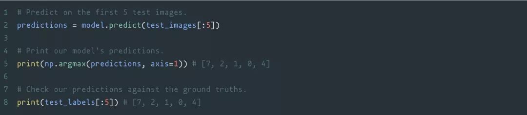 使用经过训练的模型进行预测很容易:我们将输入数组传递给 predict(),它返回一个输出数组。请记住,我们网络的输出是 10 个概率(因为 softmax),所以我们将使用 np.argmax() 将这些转换为实际数字。