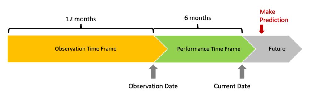 我们感兴趣的是,利用过去一段时间内客户行为的数据,预测未来一段时间内客户违约的可能性。选择这些框架的大小是一个比统计更重要的业务/谈判决策,请记住,它们必须足够大,能够包含多个客户的行为观察结果。窗口太短会增加观察结果的方差,因此模型会失去精度。