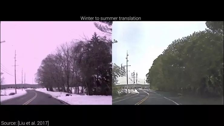 英伟达推出的新技术无监督图到图迁移网络,可以根据已有的图像,创造出不同场景下的新图像。比如,把冬天变成夏天,把城市照片换成城市地图,将白天公路换成夜间公路。