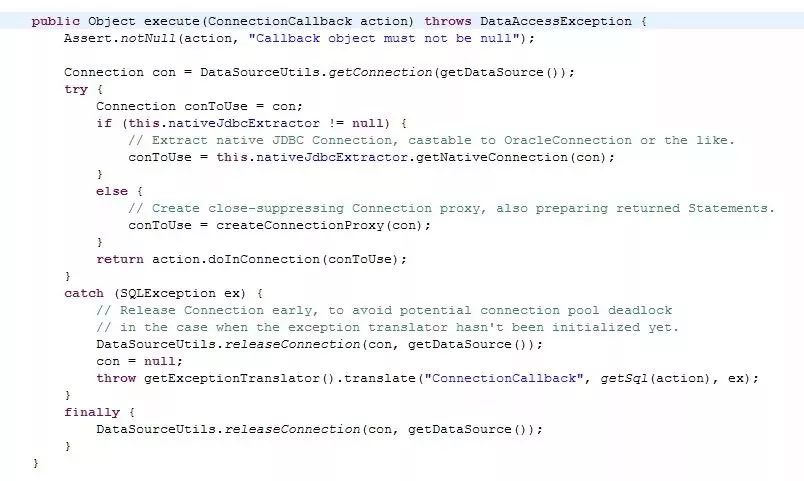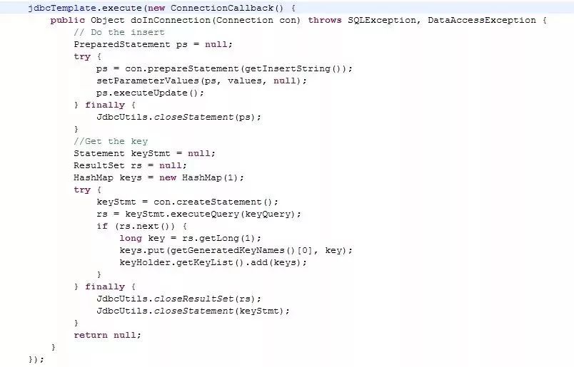 Template Method模式一般是需要继承的。这里想要探讨另一种对Template Method的理解。spring中的JdbcTemplate,在用这个类时并不想去继承这个类,因为这个类的方法太多,但是我们还是想用到JdbcTemplate已有的稳定的、公用的数据库连接,那么我们怎么办呢?我们可以把变化的东西抽出来作为一个参数传入JdbcTemplate的方法中。但是变化的东西是一段代码,而且这段代码会用到JdbcTemplate中的变量。怎么办?那我们就用回调对象吧。在这个回调对象中定义一个操纵JdbcTemplate中变量的方法,我们去实现这个方法,就把变化的东西集中到这里了。然后我们再传入这个回调对象到JdbcTemplate,从而完成了调用。这可能是Template Method不需要继承的另一种实现方式。