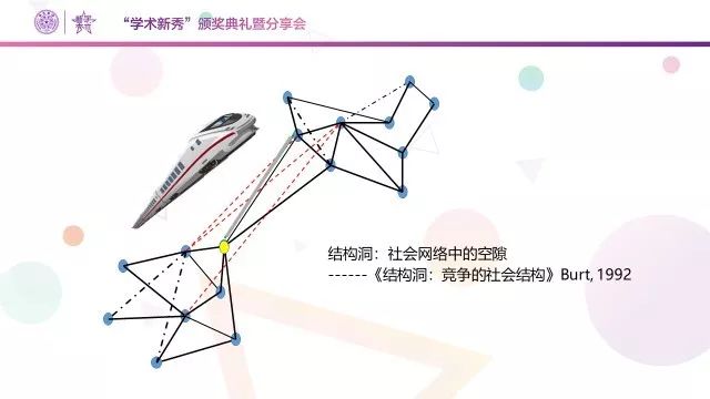 高速铁路的开通,会影响创业企业和投资者的地理分布,也会影响投资网络的结构。比如,图示两个城市中的企业集群,中间黄色的点,代表某一类特殊企业,因为他们占据了结构洞,其他企业必须要通过他才能和另一个城市的企业建立联系,也就是起到桥连接的作用。这里企业是具有独占性信息优势的。但是高速铁路联通这两个城市后,更多的跨城市投资形成,原来的结构洞所代表的独占性信息优势减弱。这也就是我的论文的主要贡献之一,提出了动态情境下的社会资本理论。