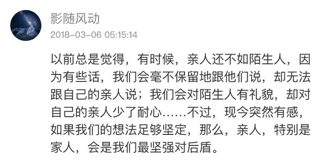 小椰子:有句话说:“我们最大的错误,就是把最差的脾气和最糟糕的一面都给了最亲近和最爱的人,却把耐心和宽容给了陌生人”。