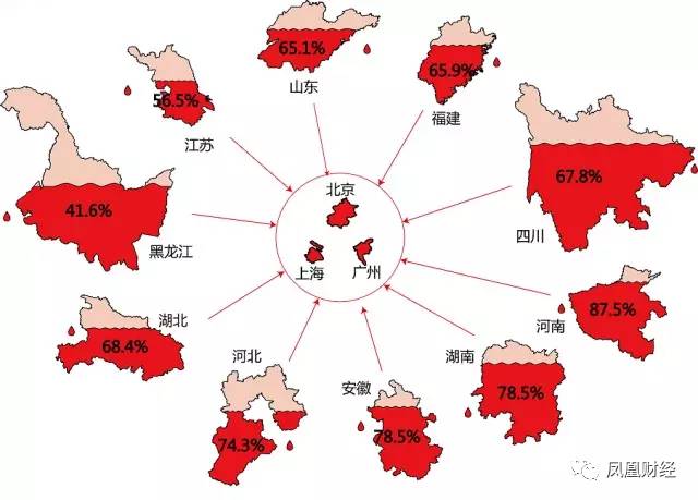 城市数据团曾计算过2050年,北京、上海、广州三个一线城市从十个劳动力供给省份的抽血量,结果得到上图(数字为“北上广”抽满之后这些“供给省”所剩下的劳动力“血量”)。而像江苏这种省份,本身也会从其它地区抽血。