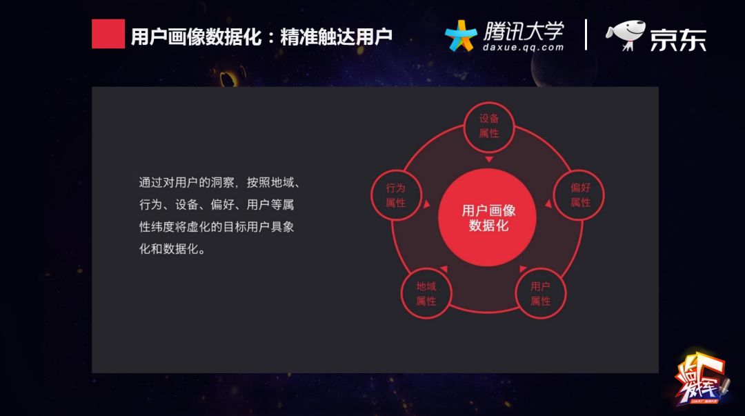一方面,京东通过将用户画像数据化,达到精准服务用户的目的。所谓用户画像,就是京东的大数据工作者,通过数据去描绘这个用户。京东最多给用户打过300多个标签,这些标签中甚至还包括用户有没有宠物、需不需要装修、有没有车载设备、买没买过大家电等很多周边信息,京东通过对这些信息进行梳理、进一步细化、精准化,形成常用的几十个标签。