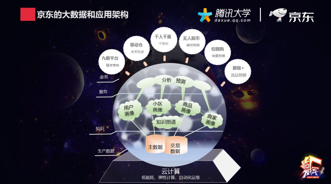 再往上一层叫做知识层,就是从简单的交易数据变成一些更加人性化或者更加偏社会科学的数据。比如京东用很多画像去描绘用户、描绘商品、描绘小区。