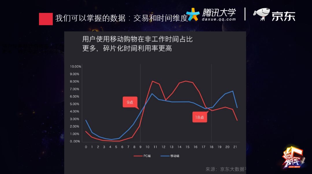 中午12点,这个曲线又会掉下去,因为用户出去吃饭了,无法在PC端上进行购物。下午2点-4点,又会拉起一个购物的小高峰,因为下午的会议又开始了,开完几个会以后,用户需要平复一下心情,再买一点东西。