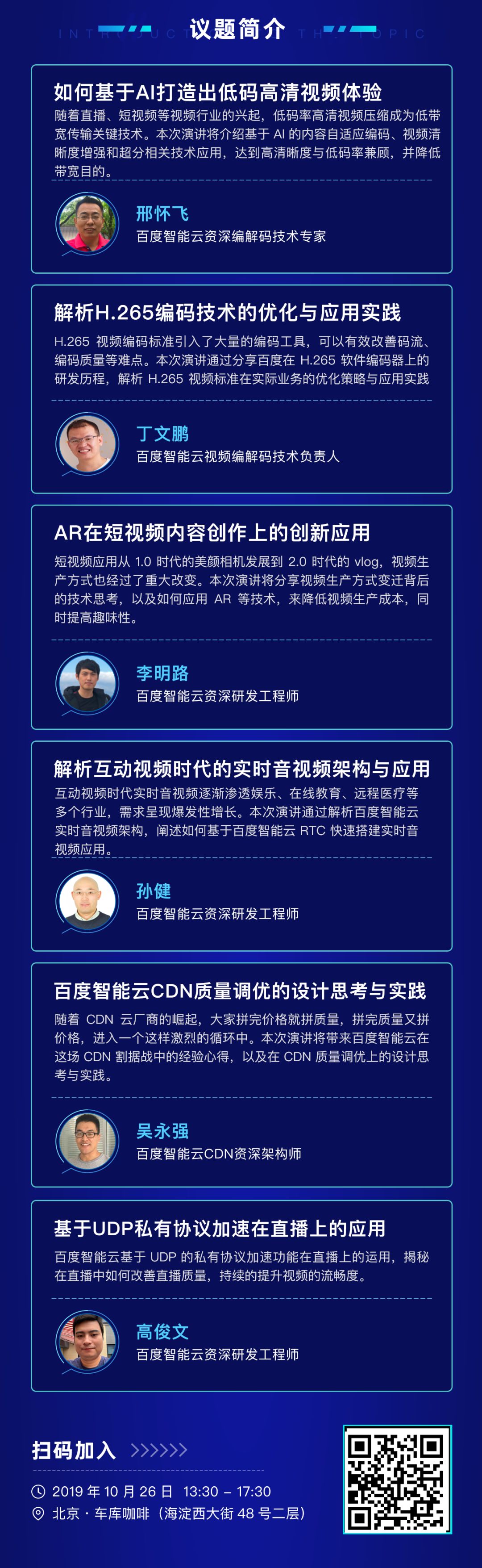 百度专家技术分享:AR在短视频内容创作应用,如何基于AI打造低码高清视频,互动视频时代的实时音视频架构技术与应用等。