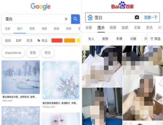同样的词汇,在谷歌搜图上找到的就是雪白的场景或者颜色,而百度出现的确实各种不可描述(已打码),虽然经过 AI 前线编辑的实测发现百度并没有出现上述情况,不知道是因为“求生欲”还是其他原因。