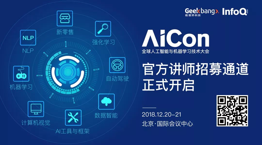 第二届 AICon 全球人工智能与机器学习技术大会强势来袭,大会设置 8 大专场、汇集机器学习、计算机视觉、搜索推荐、自动驾驶、深度学习、AI 工具与框架、知识图谱、新零售、NLP、GAN 等 20+ 技术热点,邀请国内外 50+AI 领域一线技术专家为大家带来 AI 落地案例干货演讲,扫描下方二维码或点击阅读原文了解详情~