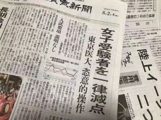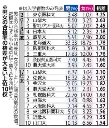《读卖新闻》于2018年8月初进行了一项调查,询问了全日本81所设立医学部大学的男女录取比,结果显示,在76所做出回答的大学中,有59所在春季的一般考试中录取了更多男生,而且,在男女录取比差距排行前10名的受访高校中,18年的录取差距均普遍比17年还大。