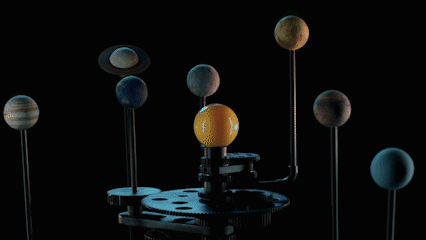 通过多级齿轮啮合的结构,我们模拟了太阳系中八大行星的运动规律——根据万有引力定律,越在外面轨道的行星绕太阳公转的周期越长。不过,装置中行星的尺寸、公转周期和现实都是不一样的。毕竟体积最大的木星足足有地球的1361倍,离太阳最近的水星公转周期只有88天,而最远的海王星却是164年。专注在原理的装置就不强求比例啦!