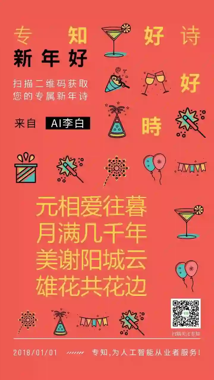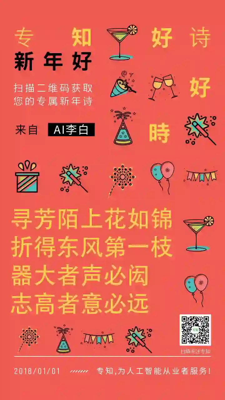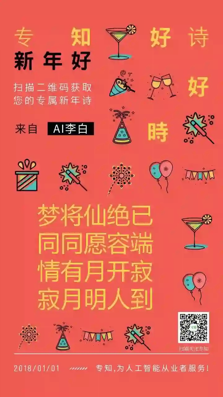 请大家在专知公众号后台回复2018心愿词(汉字,如:新年、春节、梦想等等),人工智能“李白”自动写诗生成2018春节卡片(下图卡片),并回复给您,请保存卡片到相册,一键可转发到微信朋友圈分享给好友哟!