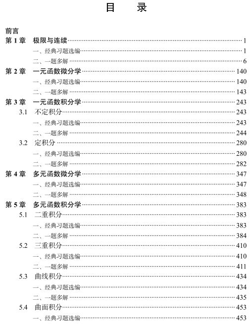 本书主要分为极限与连续、一元函数微分学、一元函数积分学、多元函数微分学、多元函数积分学、向量代数与空间解析几何、微分方程和级数等八章内容,每个章节又分为两个部分:第一部分是章节经典习题选编;第二部分是对选编的习题分别给出一题多解典型解法、特别提示和类题训练等三个环节。