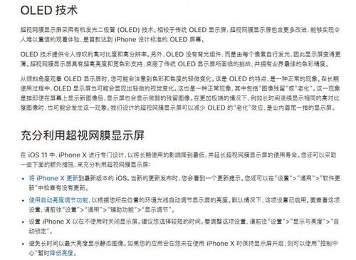 在苹果官网技术支持一栏了解iPhone X下了解超视网膜显示屏中,对超视网膜显示屏采用的OLED(有机发光二极管)技术作出了详细的介绍,既介绍了OLED技术的优势,也介绍了OLED显示屏存在的不足。