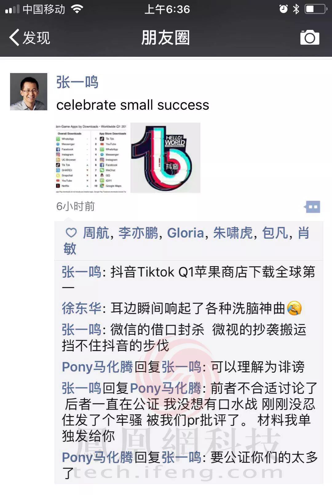 张一鸣在微信朋友圈表示:“微信的借口封杀,微视的抄袭搬运挡不住抖音的步伐。”公然在朋友圈说自家的不好,这话马化腾看了当然不高兴,回复称:“可以理解为诽谤。”
