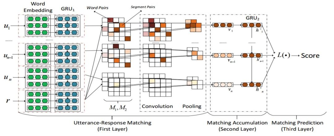 目前关于检索模型的闲聊还停留在单轮对话中,下面这篇论文提出了基于检索的多轮对话闲聊。论文提出了一个基于检索的多轮闲聊架构,进一步改进了话语关系和上下文信息的利用,通过将上下文中的语句与卷积神经网络的不同层级进行匹配,然后通过一个递归的神经网络在时间序列中堆积这些向量,以建立对话之间的关系。