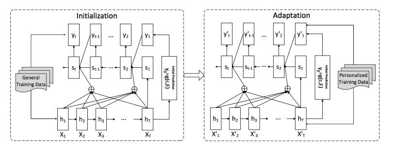 下图的模型提出了一种两阶段的训练方法,使用大规模数据对模型进行初始化,然后对模型进行微调,生成个性化响应。