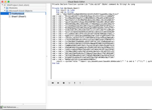 当受害者打开该恶意文档,会出现以下宏调用界面,如果点击enable macros按钮之后,恶意宏代码将会执行。