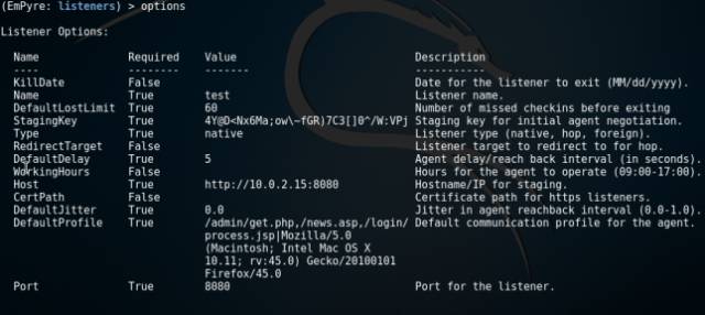 其中,默认Listener进程为test,其它信息可以根据目标系统进行设置修改