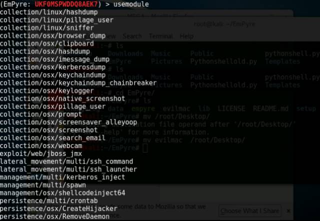 EmPyre是一款基于Python,远程入侵OSX系统的Post Exploitation框架工具。它内置有OSX漏洞利用模块,与Metasploit相比,让人耳目一新。