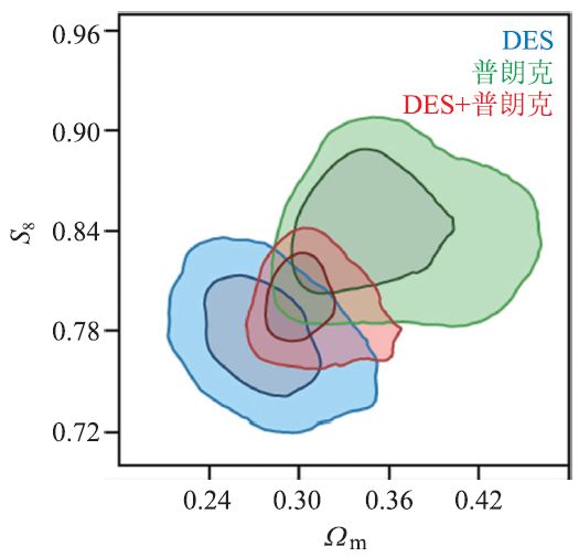 DES系列工作中最重要的一项是,与普朗克卫星最新CMB 测量结果进行了比较。CMB 是在宇宙大爆炸约38 万年后光与物质脱耦时残留的辐射,故普朗克探测高红移(z~1100)宇宙。但是,DES测量的是最近的宇宙,红移z 为0.2~1.3。要审视普朗克和DES 结果是否一致,需要在标准宇宙学模型框架内外推宇宙演化史(从z~1100 到z~1)。在实验误差内,两者显现较好的一致性(图2),也佐证了标准宇宙学模型的预测能力。虽然这一成功值得赞颂,但人们还是期望实验上发现对ΛCDM 模型的偏离,从而提供些暗物质和暗能量新的蛛丝马迹。