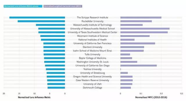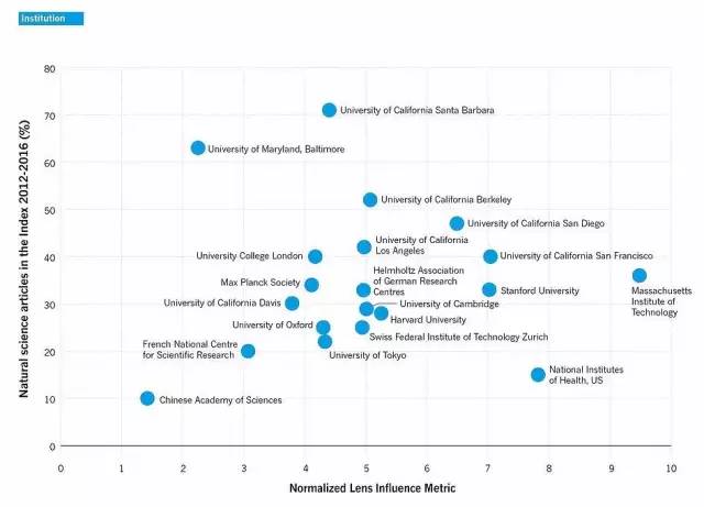 根据归一化加权分数(normalized weighted fractional count),Lens 指标最高的一些机构,发表的论文自然指数也很高,这表明其论文质量很高: