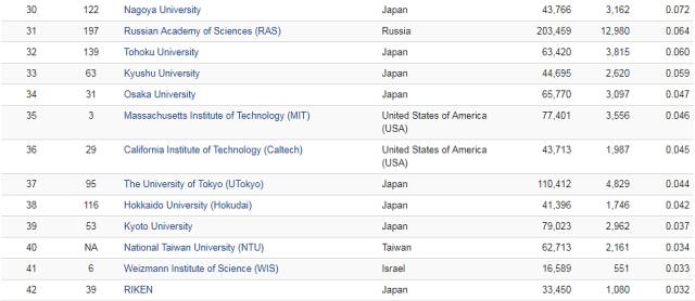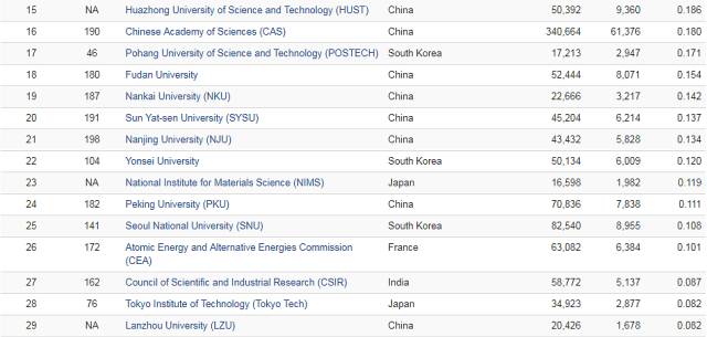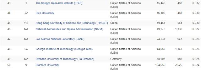 值得注意,Top 10 中唯一的非美国机构来自以色列——排在第 6 的魏兹曼科学研究所(WIS),而韩国的汉阳大学(HYU)排在第 23,是亚洲国家机构里最靠前的。