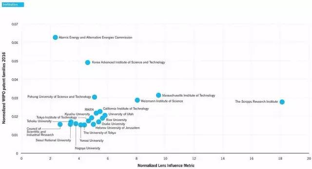 而法国的原子能和替代能源委员会(Atomic Energy and Alternative Energies Commission)等机构,倾向于对其大部分研究进行专利授权,因此正则化 WIPO 专利族分数(也即 WIPO 专利族/ 2016 年 STEM 文章)更高。