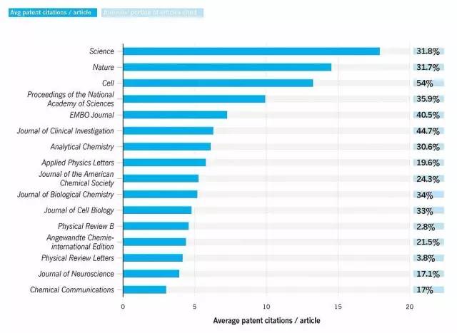 Lens 分析还将自然指数中包含的杂志按照其每篇文章的平均专利引用做了排名,如下图天蓝色柱状图所示,Science 排在第一,Nature 以 0.1% 的差距紧随其后。