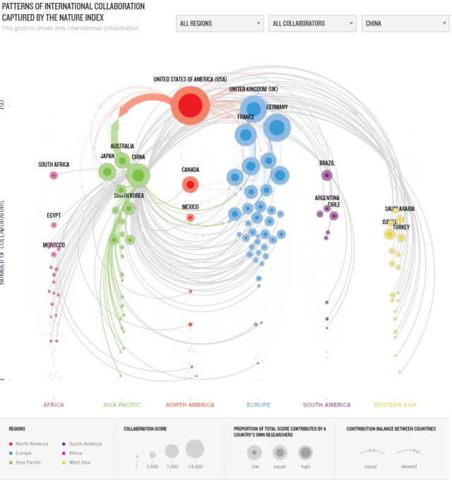 下图展现了中国学术国际合作情况,其中,最大的绿色圆圈代表中国(绿色是亚洲国家),红色代表美洲国家,蓝色是欧洲。圆圈本身的大小代表了该国综合合作项目的多少,圆圈之间的连线表示合作强度。