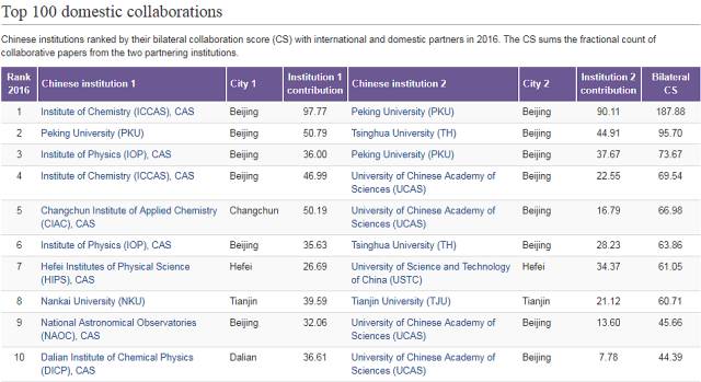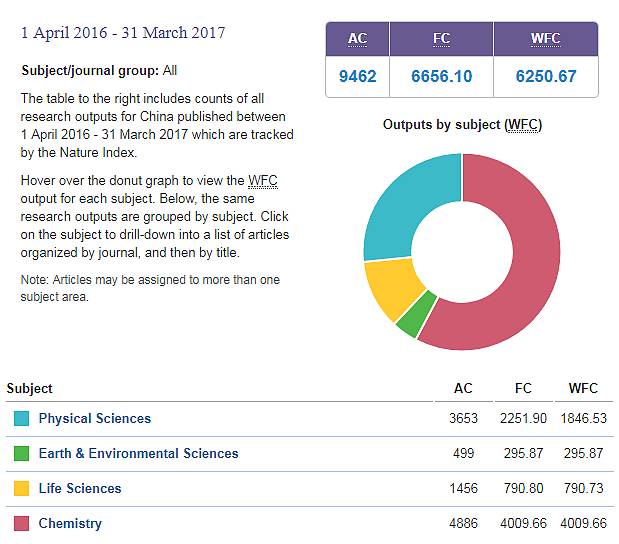 说完科研的技术影响,我们有必要看看科研实力本身,因为这是技术转化的根本。中国自然指数 2017 是一个很好的参考。下图显示了 2016 年 4 月到 2017 年 3 月之间,中国科研论文发表情况。
