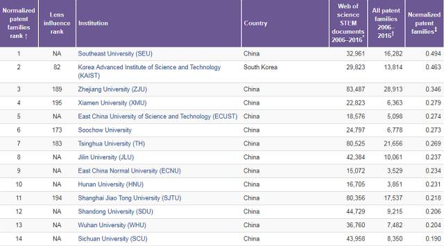 其中,东南大学排名第一,浙江大学排名第三(Lens 指标 189),厦门大学第四(Lens 指标 196),华东理工大学排第五。