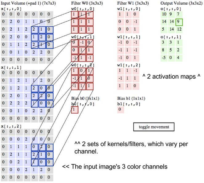 当图像通过卷积网络时,我们将根据输入卷和输出卷来描述它们,在数学上将它们表示为这种形式的多维矩阵:30x30x3。 从一层到另一层,它们的尺寸会发生变化,原因将在下面解释。