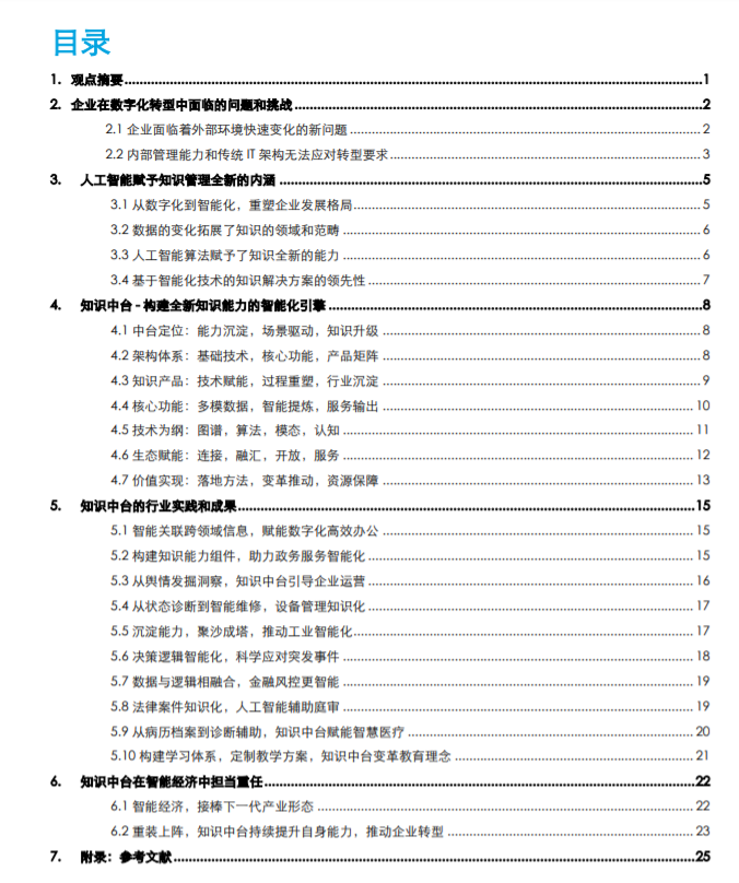 知识中台在产业智能化升级中,担当重任。知识中台作为新经济形态下的智能化方案,将持续从技术、行业应用、 生态合作的角度进行提升,更好地赋能企业,为企业在智能经济中取得先机持续提供动力。技术方面,知识中台的 数据处理能力将由结构类、文档类数据,拓展至图片、音频、视频在内的多模态数据;知识中台将提升复杂知识表 示和快速构建技术,提升数据知识化的效率。应用方面,知识中台将由搜索、问答、推荐,升级至辅助决策、预测、 推理等各类业务场景的知识深度应用,满足企业产品与服务的自动化定制需求,驱动产业智能化升级。