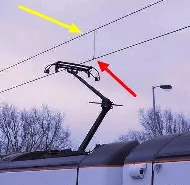 铁轨上方的线有两根,顶部那根起到悬挂的作用,而下方的那根线才是与受电弓接触的线。