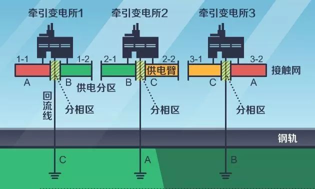 由于牵引供电系统采用单相交流电,如果全程只用一相,肯定导致不平衡。解决方式就是通过换相实现三相平衡。也就是说一相用一段,三相循环着用。具体的换相流程如下:在变电所中,三相交流电变为了A相、B相、C相三相电,将其中的一相接地,另两相分别通往变电所两侧的供电臂(如图牵引变电所供电臂分别为A相、B相,而C相接地了)。一般而言,相邻变电所的相邻供电臂的相位相同。具体设置如下图所示,一个供电分区里都是相同相位的电哦。(为了让您看清楚,特地用颜色进行区分了哦~,如图中牵引变电所1和2之间的供电分区都是B相电、牵引变电所2和3之间都是C相电等)。