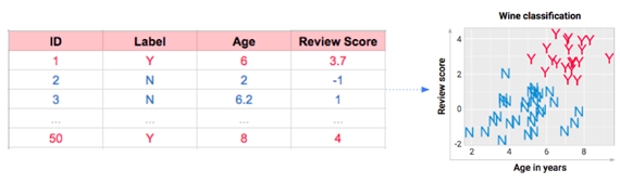 想象我们品尝了50种葡萄酒,并且为了方便展示,我在下面进行了数据可视化。每款酒的数据包括年份、分数,再加上我们想学的特征:Y代表好喝,N代表不好喝。