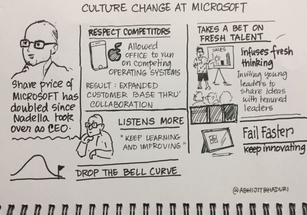 时光之轮将我们带到了 萨蒂亚·纳德拉 领导下的现在,纳德拉放弃了两位前任 CEO 的发展策略,排除万难,重振微软,并让它重返巅峰。如今的微软已经不再是一家技术和销售推动型公司了。纳德拉已经开始着手将公司转变为文化驱动型企业,这种转变让一些历史遗留问题得到解决。更通俗地讲就是——如果公司像以前一样充斥着各种追名逐利的人,那么公司如何朝着新时代发展?