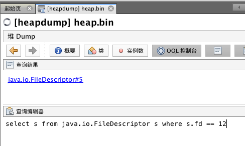 把heap dump文件导入VisualVM里,然后在“OQL控制台”查询上面的语句,结果是:
