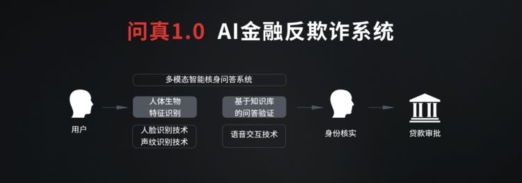 我们有一个系统根据你说话,它会自动问你一些问题,这个问题不是提前设好的,是根据你说的话来问,系统也知道答案。根据你回答的答案和系统答案是不是一致,就可以判断是不是真话。这里面用到很多,还有人脸识别,识别是不是你,还有基于数据库的对话系统,判断你是不是真实的,是真实的才会进行贷款的动作。
