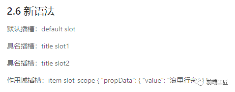 在 2.6.0 中,我们为具名插槽和作用域插槽引入了一个新的统一的语法 (即 v-slot 指令)。它取代了 slot 和 slot-scope 。 我们通过一个例子介绍下默认插槽、具名插槽和作用域插槽的新语法: