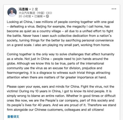 2月9日,大众汽车集团(中国)CEO 冯思翰博士就疫情在个人领英平台上发出的呼吁,建议全世界的人们都应该携起手来抗击病毒,并指出国际社会“一小部分人以病毒为借口离间、诋毁、制造恐慌,以这种行为博得关注是错误的。”