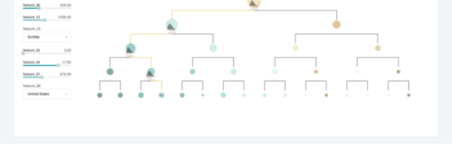 对于重要的模型类型,我们亦提供更为复杂的可视化工具以帮助建模者了解模型的行为原理,并在必要时对其加以调试。在决策树模型用例当中,我们允许用户浏览其中的每一单独树状结构,查看其对于整体模型的相对重要性、各分割点、每项特征对于特定树状结构的相对重要性,以及各分割点的数据分布情况等。用户还可以指定特征值,并以可视化方式查看决策树因此形成的触发结果、各树状结构的预测结论以及模型的整体预测结果,具体如图六所示: