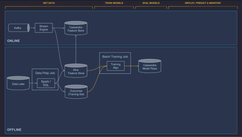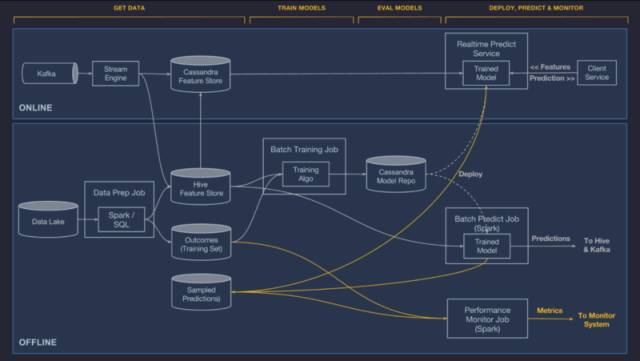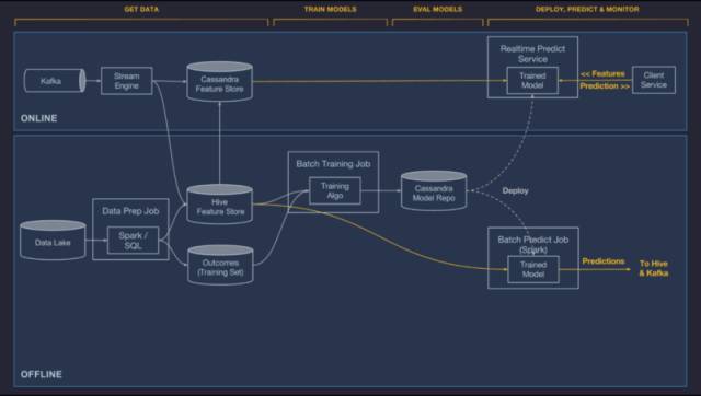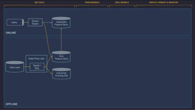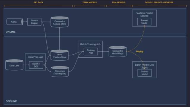 以在线方式部署的模型无法访问存储在 HDFS 当中的数据,而且其通常也很难直接面向用于支持优步生产服务的在线数据库进行高成效特征计算(举例来说,我们无法直接查询 UberEATS 订单服务以计算某家餐厅在特定时段之内的平均食物筹备时长)。相反,我们允许对各在线模型所需要的特征进行预计算,并将结果存储在 Cassandra 当中——如此一来,这些结果即可在预测阶段以低延迟方式接受读取。
