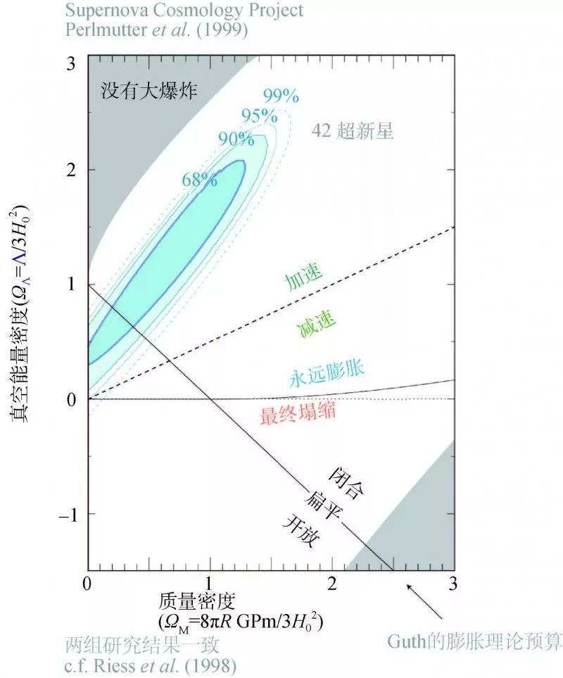 从图6可以看出,超新星观测给出的允许范围如曲线所示。对于加速区(横轴是质量密度,纵轴是真空能量密度),斜线是宇宙暴胀理论预言的平坦宇宙区,下面是开放宇宙区,上面是闭合宇宙区。