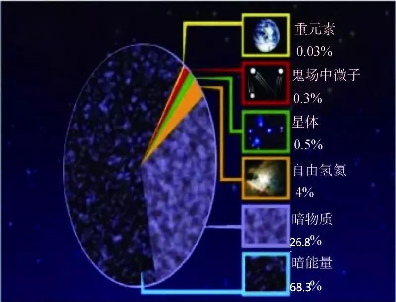 宇宙物质的构成如图9所示,各种明亮物质的比例是重元素为0.03%,中微子为0.3%,星体物质为0.5%,氢和氦为4%,可见重子物质中绝大部分是自由的氢和氦,其他的物质和能量均为不可视的。