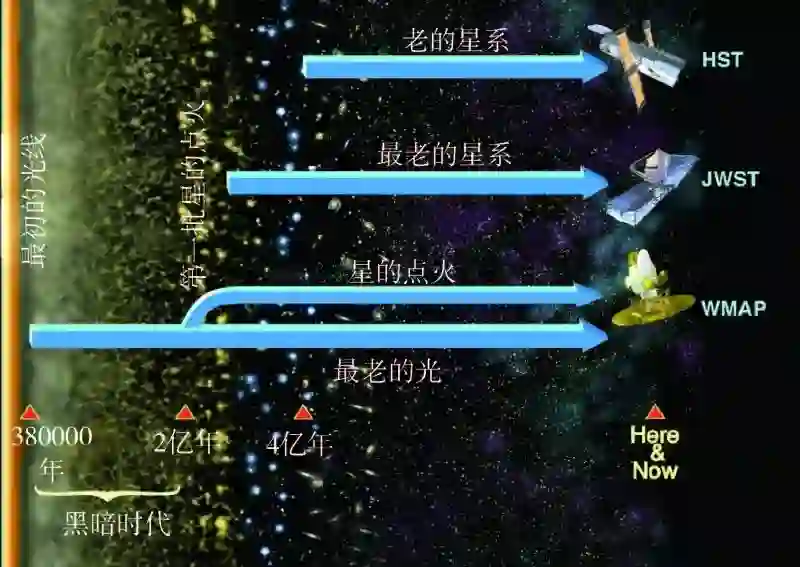 图3显示了宇宙的发展和演化,横轴表示时间的演化。最上面显示的是老的星系的产生和演化,下面的是最老的星系的产生和演化,它们产生的时间要早得多;宇宙大爆炸发生在38万年时,发出了最初的光线,也可以说是最老的光;到2亿年时,开始有了星的点火。宇宙(大爆炸)产生后38万年到2亿年时,是宇宙的黑暗时代;到10亿年时,形成了第一批星的点火,持续发出最老的光。