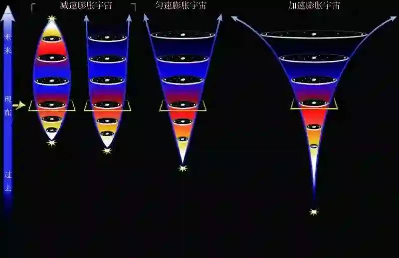 哈勃定律在很大范围内成立,说明目前我们所在的宇宙正在持续膨胀着。宇宙从138亿年前的大爆炸开始,除了在早期可能有爆胀外,一直在不断地膨胀着,直到现在。但是,作为宇宙演化的模式,存在着三种可能性(如图2所示),即减速膨胀宇宙、匀速膨胀宇宙和加速膨胀宇宙。