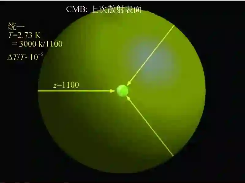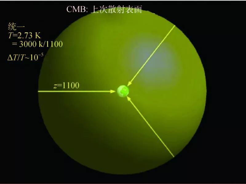 由于宇宙在膨胀,现在观察到的这些光子是来自远方发出的光子。上面提到,若接收点的距离可用红移表示为z=1100,这是多普勒效应的反映,现在观察到的这些光子所体现的温度应该是:T=3000K/1101=2.725K,这与现在的观测结果符合得很好。