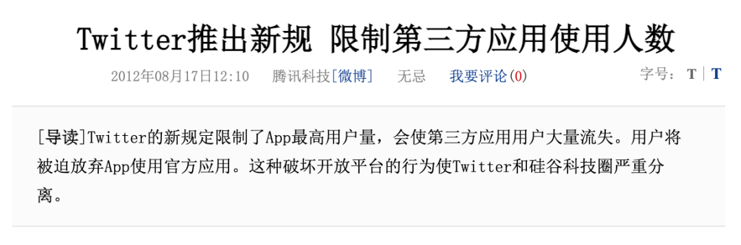 2010年,Facebook屏蔽了推特的“查找好友”接口,推特指责Facebook“拒绝开放,违背互联网精神”;2012年,推特自己屏蔽了所有用户数超过10万的第三方应用接口。
